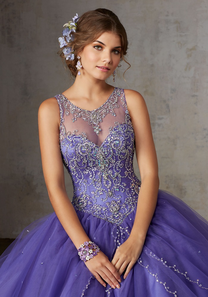 Accented with Jeweled Beading, This Split Front Tulle Quinceañera Ballgown Features an Intricately Beaded Bodice with Jewel Illusion Neckline. Matching Stole Included. Keyhole Corset Back. Colors Available: Blueberry, Coral, Aqua, White, Blush.